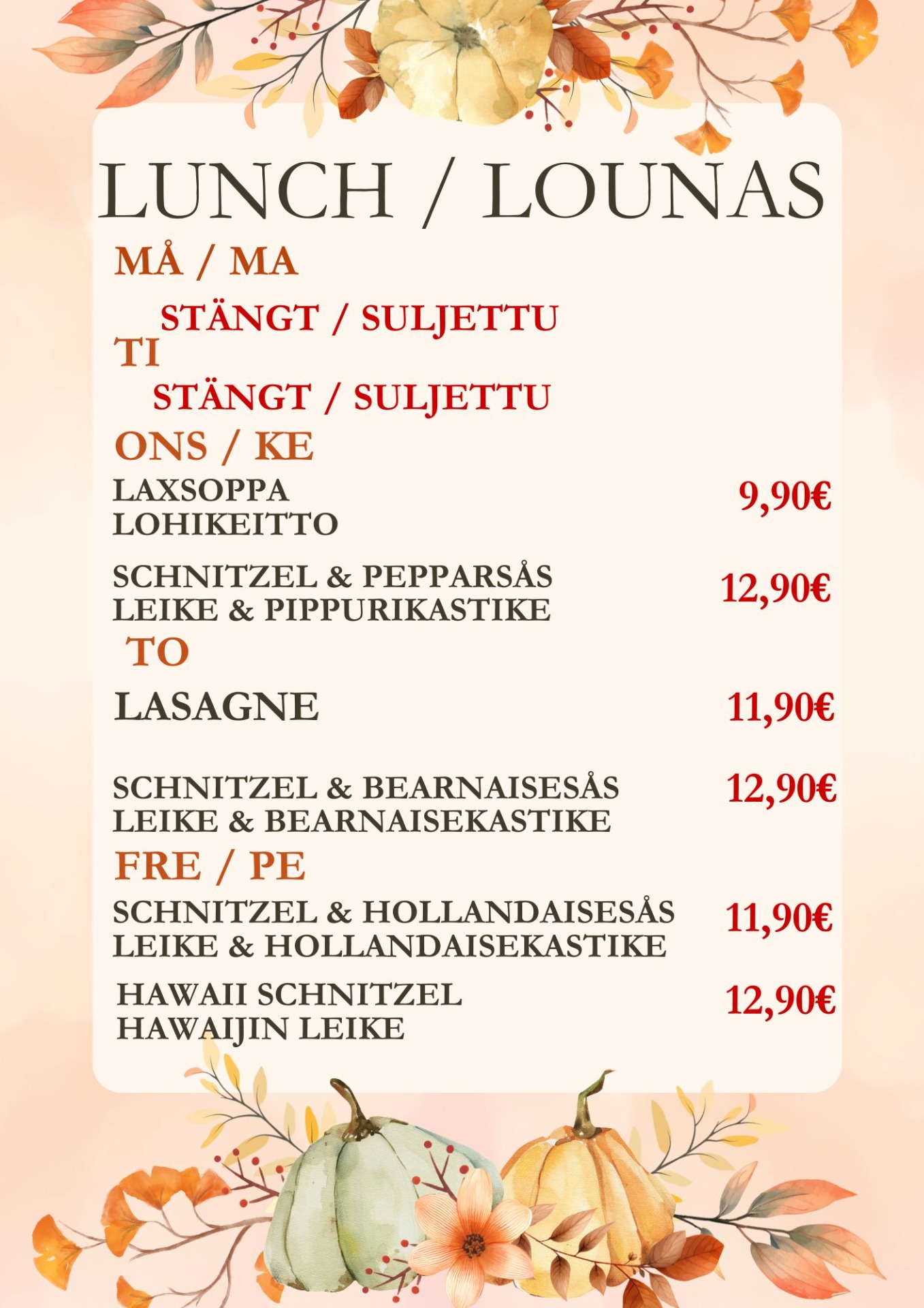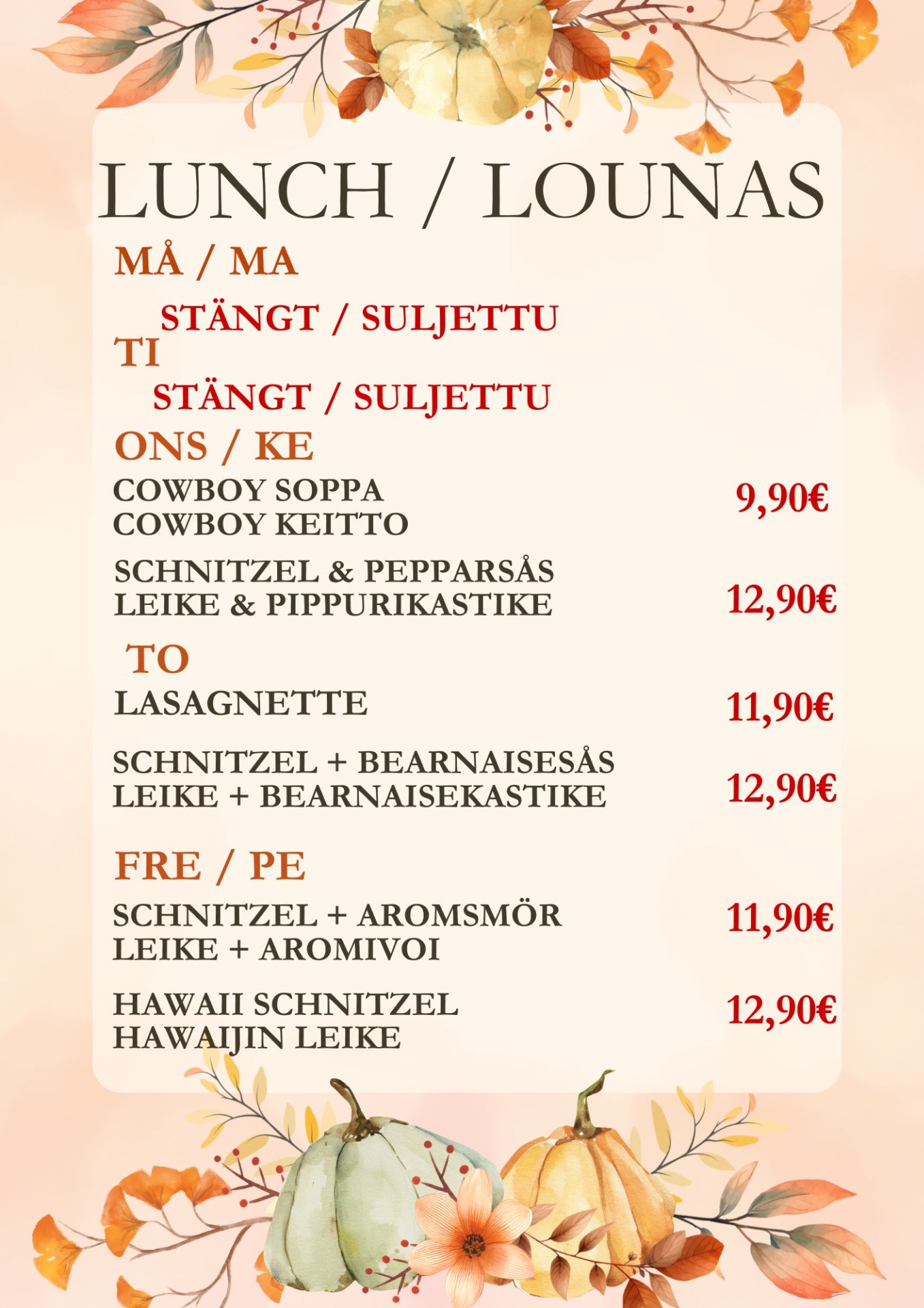 Köket stänger ½ timme före stängning | Keittiö sulkeutuu ½ tuntia ennen sulkemista.